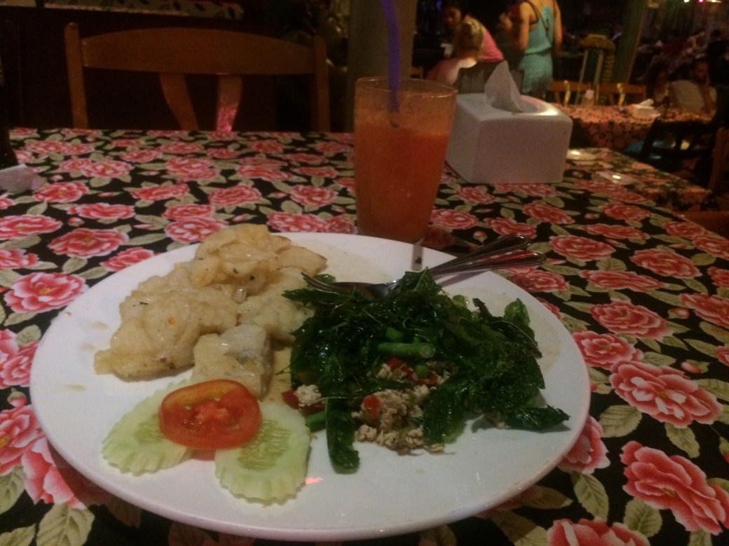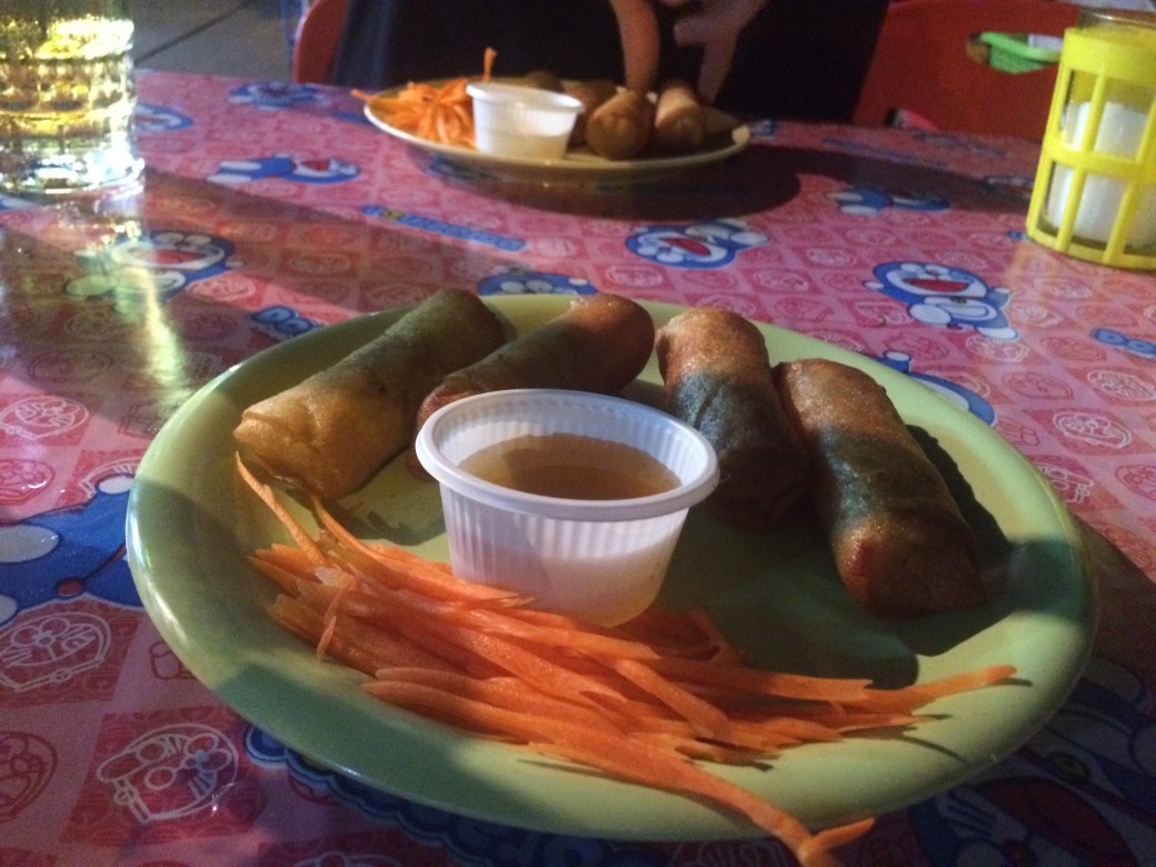 As you’d expect, a bamboo house doesn’t offer you much privacy and you can forget about silence. You can hear everything and you can also see through the walls because the bamboo branches they use are not very thick and they have little gaps in between. Our dinner has been prepared by the locals, served on a little improvised table just in front of the house, where we sat in turkey seats on the floor and ate with a big appetite after the active day we had behind us.