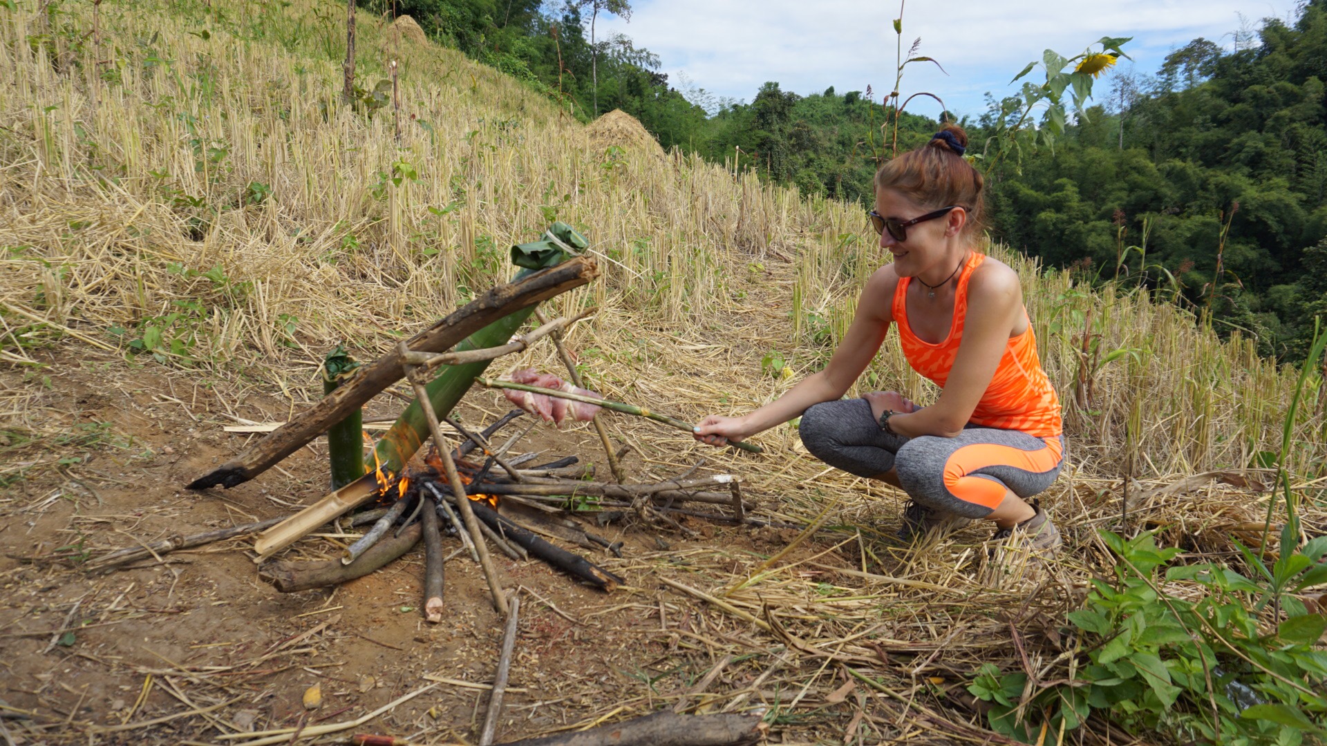 At lunchtime our guide set a fire in the middle of the nature, broke some eggs in a bamboo brench and while the meal was getting ready he tried to reach me to make a bamboo cup. That was mission impossible but great fun.